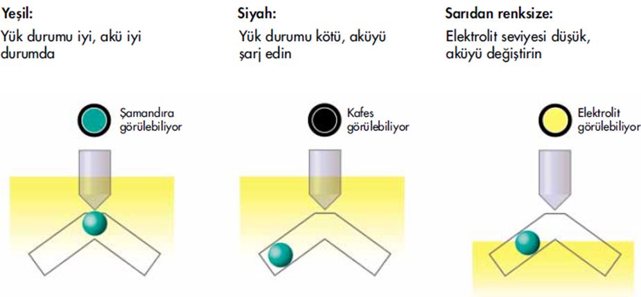 seviye/şarj gösterge deliği varsa buraya bakılır, sarı renkliyse elektrolit