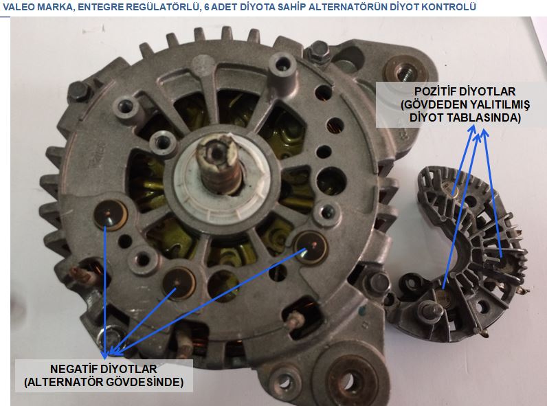 İlk uygulamada valeo alternatör tamamen sökülür, statör sargı uçlarının diyotlara lehimlenen kısımları koparılır, diyot tablası çıkarılır ve detaylı olarak kontroller yapılır.