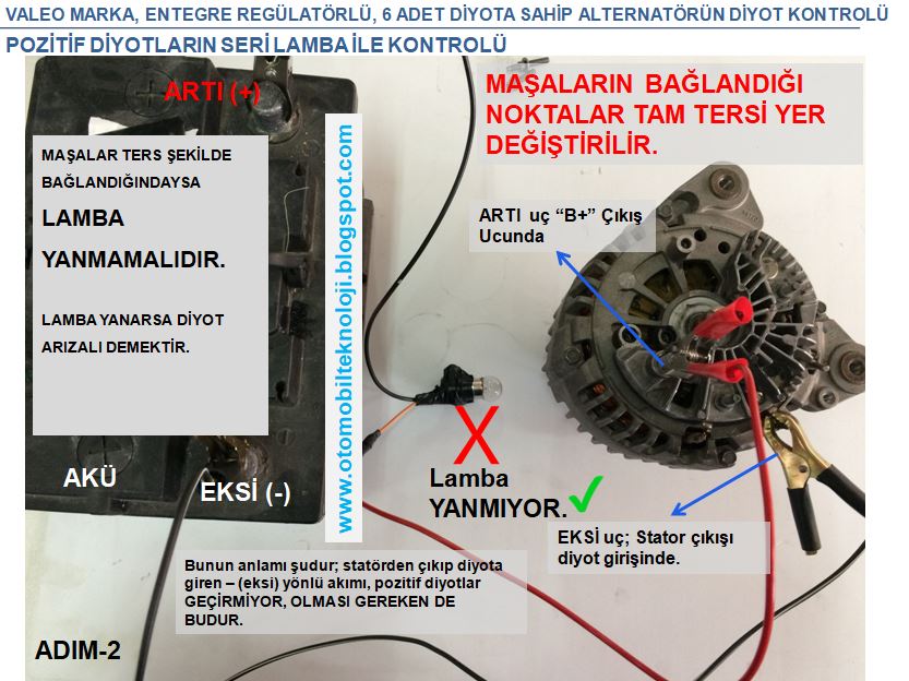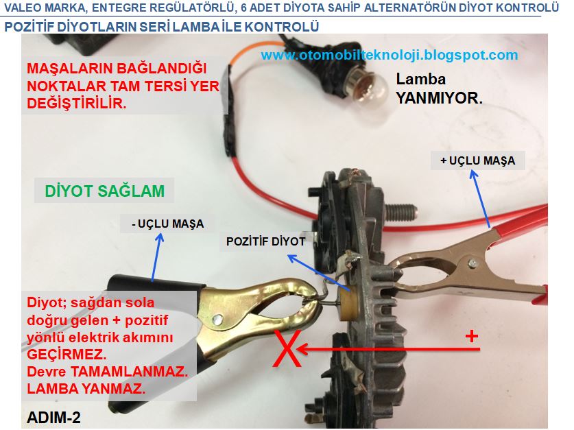 Adım 1: Eksi uçlu maşa, stator çıkışına (diyot girişine) bağlanır. Artı uçlu kırmızı maşa ise alternatrör gövdesine tutulur. Negatif diyotlar eksi yönlü elektrik akımını geçirdiklerinden ve diyotun girişine de eksi yönlü akım verildiğinden, akım geçecektir, devre tamamlanacaktır ve lamba yanacaktır. Lamba yanmazsa diyot arızalı demektir. Bu test diğer tüm diyotlar için tekrarlanır.