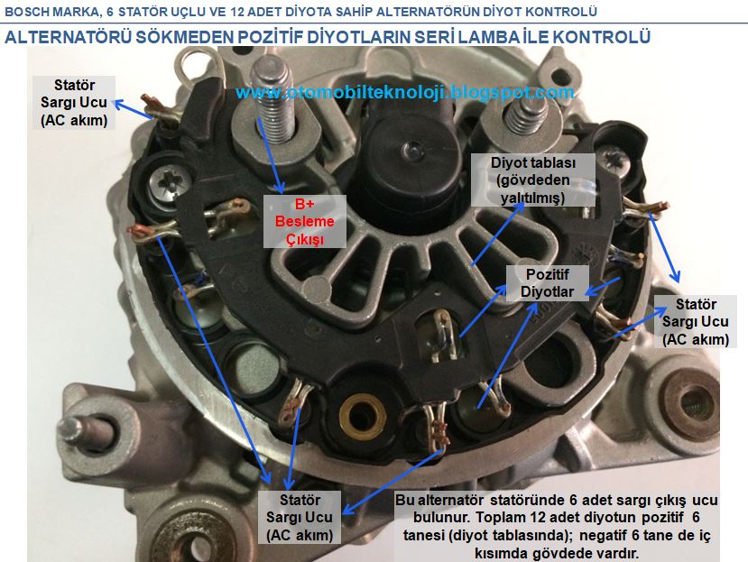 Alternatörde, statör sargılarında üretilen alternatif akımı (AC), doğru akıma (DC) dönüştüren diyotların arızalı olup olmadıkları, seri lamba ile veya avometre (multimetre) ile kontrol edilecektir. Öncelikle bakınız: Alternatörde Diyot Nedir? Ne İşe Yarar? Nasıl Çalışır?