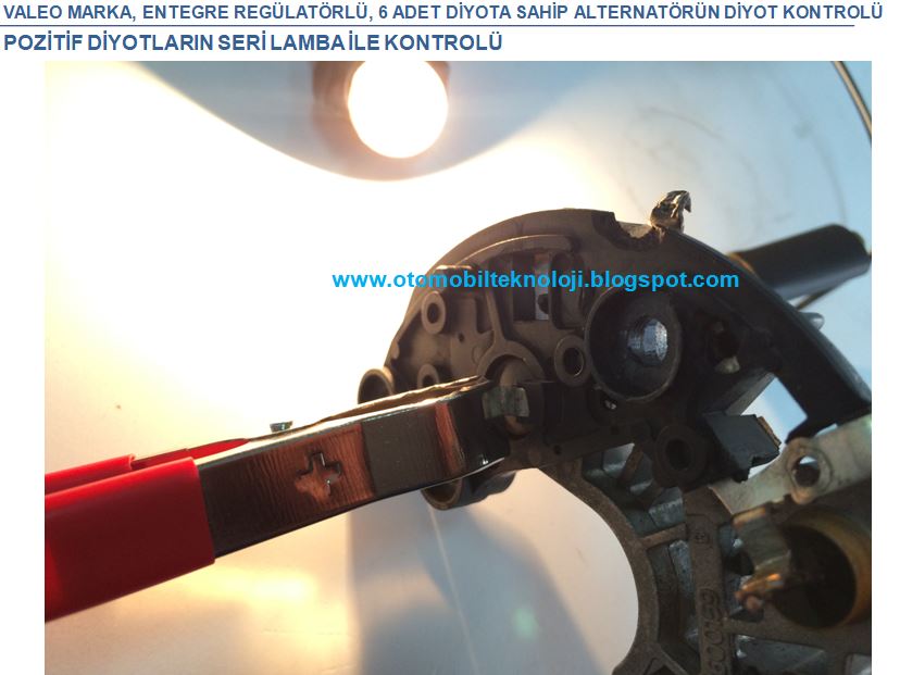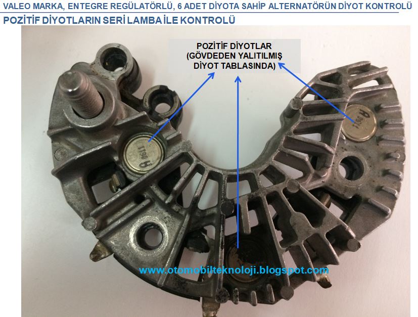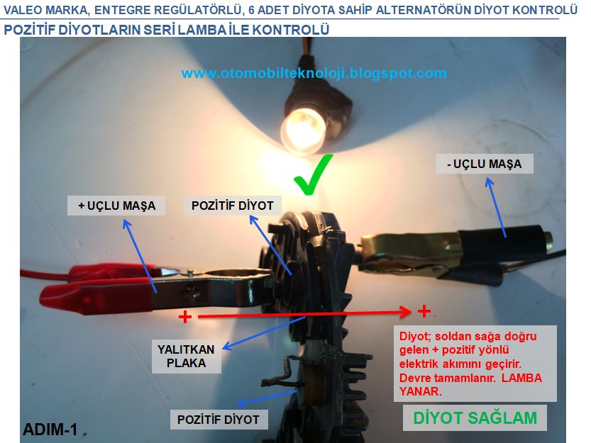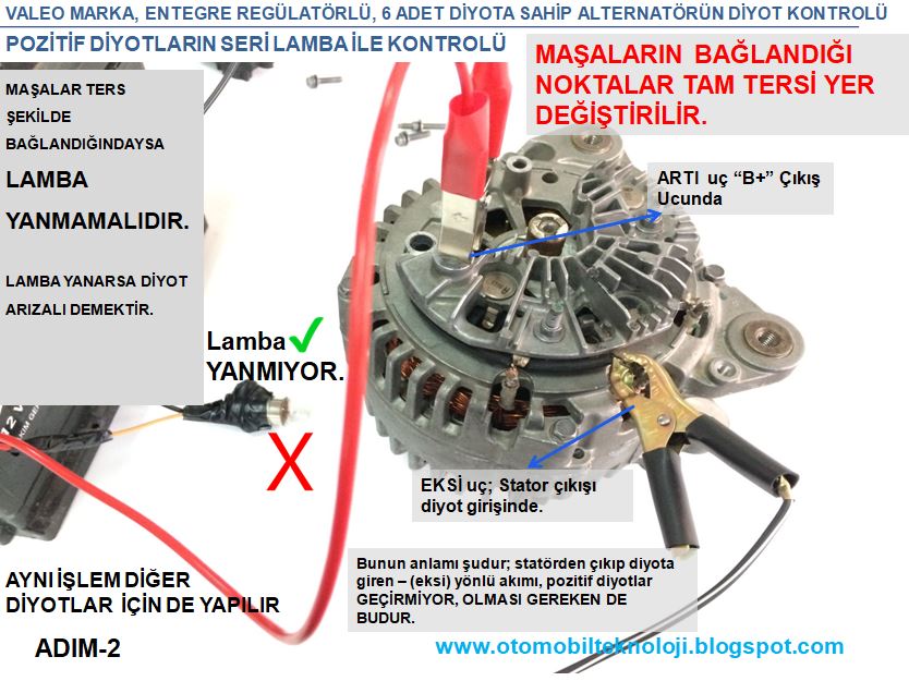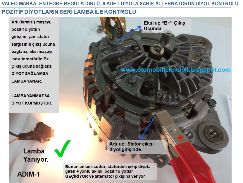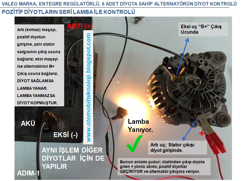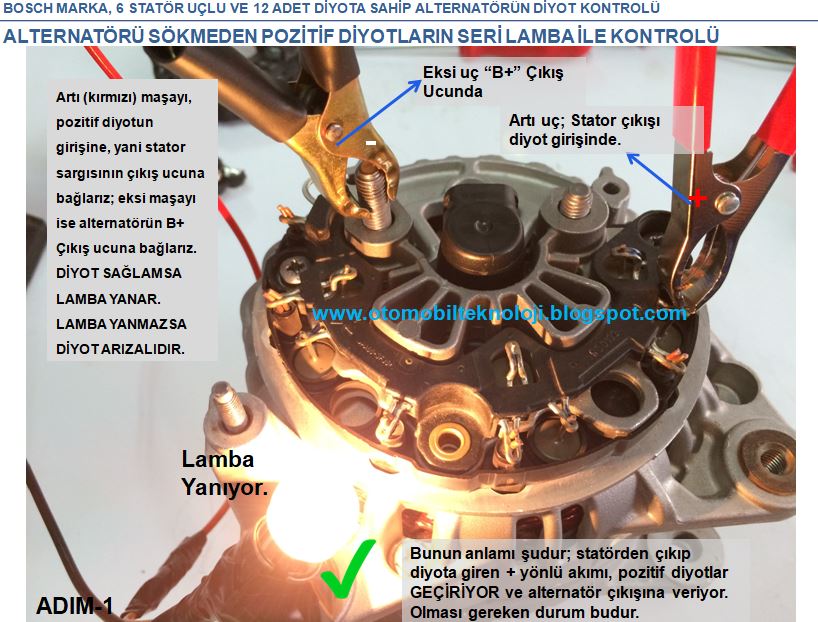 Alternatördeki negatif ve pozitif diyotlar ayrı ayrı kontrol edilecek, yapılan işlemler adım adım açıklanacak ve resimli anlatımla gösterilecektir.