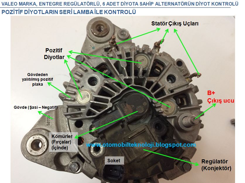 3 sargı ucuna sahip valeo alternatörde; 3 adet pozitif diyot, diyot tablasında bulunur, burada doğrulttuğu elektrik akımını + pozitif olarak B+ çıkış ucundan aküye iletir. 3 adet negatif diyot ise alternatör gövdesinde bulunur, doğrulttuğu elektrik akımını, çıkış ucundan eksi (-) olarak alternatör gövdesine, yani şasiye verir.