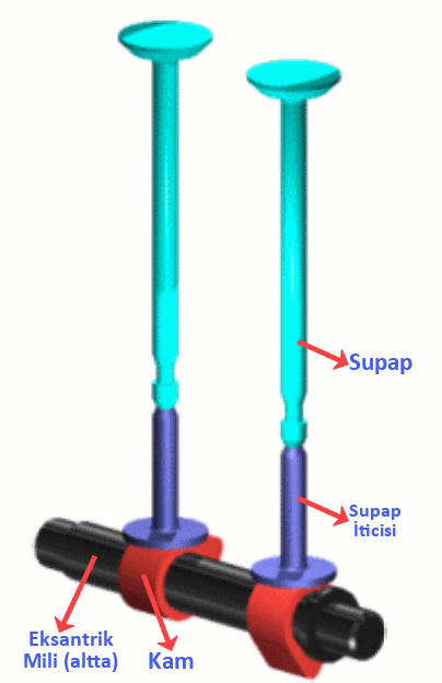 yanmalı motorların ilk örneklerinde kullanılan supap sisteminde eksantrik mili