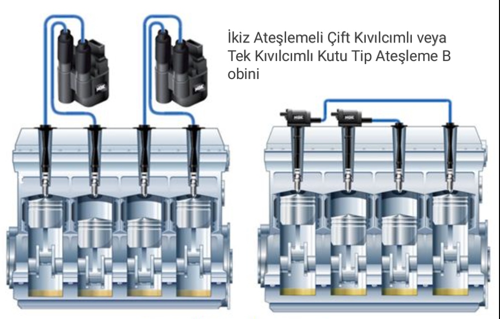 A) Eğer ikiz (kardeş) ateşlemeli tip ateşleme sistemi kullanılıyorsa, içerisinde iki adet primer iki adet sekonder sargı bulunur. İki buji aynı anda kıvılcım üretir fakat silindirlerden sadece biri sıkıştırma sonundayken, diğer egzoz zamanındadır. Örneğin 1-4. ve 2-3. Silindirlerde aynı anda ateşleme olur. Buna çift kıvılcımlı ateşleme de denir.