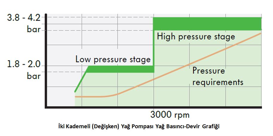 kademeli yağ pompasında, yağ basıncı iki farklı sabit değere ayarlanır, örneğin