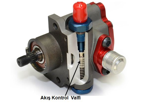 Akış kontrol valfi, pompa gövdesinde çıkış hattının olduğu kısımda bulunur ve gergin bir yay, valfi kapalı konumda tutar. Sistemdeki basınç aşırı arttığında ve bu basınç valfe etki ettiğinde, yayın itme kuvvetini yener, valf geri çekilerek delik açılır, basınçlı yağ bu delikten tahliye edilerek tekrar pompanın emiş hattına gönderilir. Böylece basınçlı yağ, kumanda valfine gönderilmeden pompada devir daim ettirilmiş ve basınç sınırlandırılmış olur. Kumanda valfi çalışırken, basınçlı yağın sirkülasyonundan dolayı sürücü ince bir ses duyacaktır.