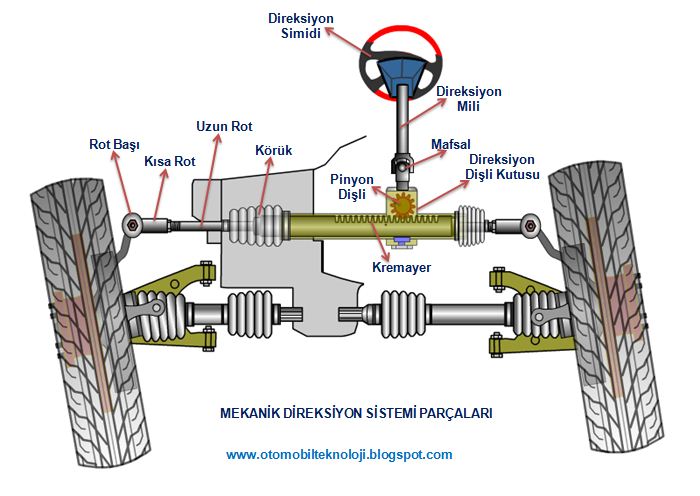 sisteminde kuvvet aktarımı direksiyon simidinden tekerleklere doğru olurken,