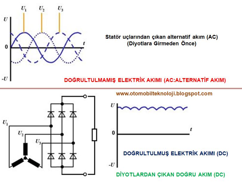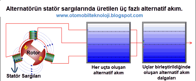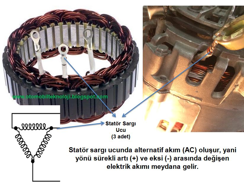 alternatif (AC) vardır, yani her statör ucu sırayla hem pozitif (+) hem negatif