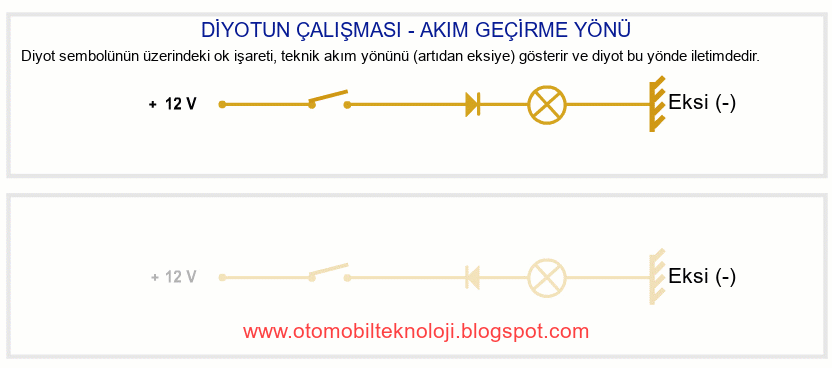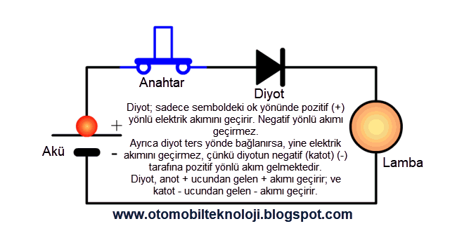 yönde geçirip, diğer yönde geçirmeyen elektronik devre elemanlarıdır. Tüm elektrik – elektronik devrelerde kullanılan diyotlar, otomotivde alternatörlerde alternatif akımı doğru akıma çevirmek için kullanılır. Motorlu araçlarda tesisat gerilimi doğru akımdır, akü bir doğru akım kaynağıdır, alıcılar doğru akımla çalışır; bu sebeple elektrik akımının doğru (DC) akıma dönüştürülmesi gerekir. Bu bölümde normal diyotlar