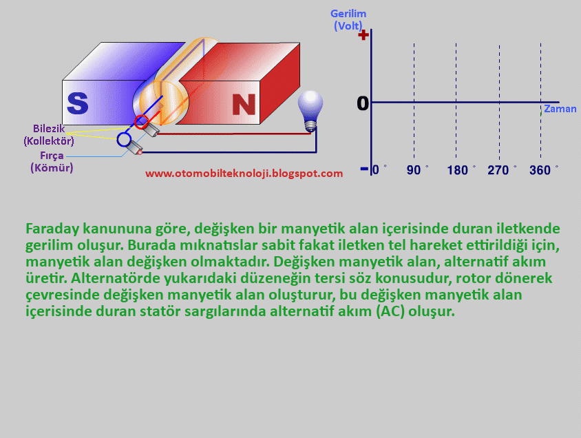 Bir alternatif akım üreteci olan alternatörde elektrik üretimi. Alternatörde değişken manyetik alan üretilmesi için merkezde dönen rotor kullanılmıştır, rotor bir mıknatıstır ve dönen mıknatıs, çevresinde değişken manyetik alan oluşturur, çevresindeki değişken manyetik alanın içinde sabit duran statör sargılarında ise elektrik akımı oluşur (faraday kanunu). Merkez bir mıknatıs olarak dönen rotor, doğal mıknatıs değil, elektromıknatıstır, yani onun bir mıknatısa dönüşebilmesi için sargılarına elektrik vermek gerekir, bu sebepler rotorun üzerinde artı ve eksi bilezikler ve fırçalar bulunur. Manyetik alanın oluşması için doğal mıknatıs yerine elektromıknatıs kullanılması sayesinde, üretecin (alternatörün) besleme (ikaz akımı, rotora gönderilen akım) akımı kontrol edilerek, çıkış gerilimi istenen şekilde düzenlenebilir. Rotoru döndürmek için yine harici bir hareket kaynağı gereklidir, burada bu aracın içten yanmalı motorudur. Üretilen akım alternatif akımdır, bu alternatif akım diyotlarla doğru akıma çevrilerek alıcılara ve aküye iletilir.