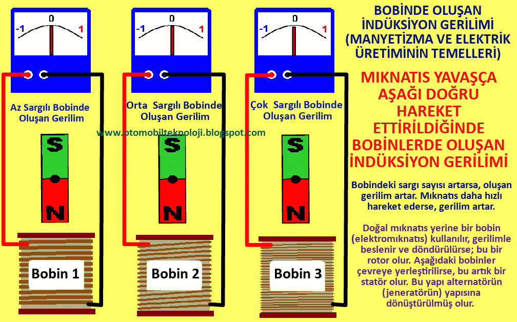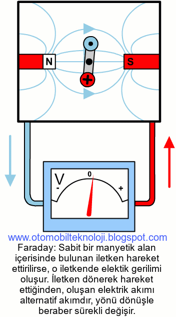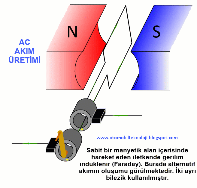 Elektrik üreteçleri (jeneratörler) hareket enerjisini elektrik enerjisine dönüştüren makinelerdir. Faraday kanununa göre, değişken bir manyetik alan içerisinde duran iletkende gerilim oluşur. Bu konuyu anlamak için önce Manyetizma konusu okunmalıdır. Değişken manyetik alanın oluşması için; ya doğal mıknatıs hareket ettirilmeli (örneğin en mantıklısı döndürülmeli), ya da iletken tel döndürülmelidir. Pratik sebeplerle doğal mıknatısı döndürmek en mantıklısıdır, çünkü iletken telden elektrik alınacağı için sabit durması daha iyidir. Ayrıca doğal mıknatıs yerine elektromıknatıs (sargı) da kullanılabilir (alternatördeki gibi). Aşağıdaki örnekte doğal mıknatıs sabit tutulmuş ve iletken tel döndürülmektedir (tam tersi de olurdu, önemli olan ikisinden birinin hareket ettirilmesi ve değişken manyetik alanın oluşmasıdır) ve bunun sonucunda alternatif akım (AC) üretilmektedir. Değişken manyetik alan alternatif akım üretir. Burada iki tarafta duran doğal mıknatıslar sabit manyetik alan üretir, fakat ortada dönen iletken tel hareket ettirildiğinden, bu tele etkiyen manyetik olan değişken manyetik alandır. Otomobillerdeki alternatörde aşağıdaki düzeneğin tersi söz konusudur, rotor dönerek çevresinde değişken manyetik alan oluşturur, bu değişken manyetik alan içerisinde duran statör sargılarında alternatif (AC) akım oluşur.