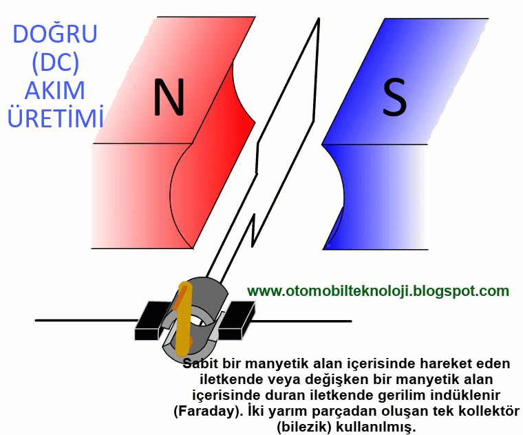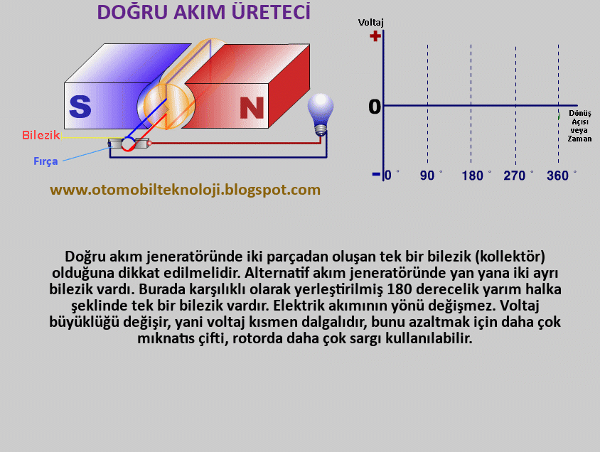 Doğru akım jeneratöründe iki parçadan oluşan (iki ayrı yarım halka) tek bir bilezik (kollektör) olduğuna dikkat edilmelidir. Alternatif akım jeneratöründe (üretecinde) yan yana iki ayrı bilezik vardı. Burada karşılıklı olarak yerleştirilmiş 180 derecelik yarım halka şeklinde tek bir bilezik vardır. Elektrik akımının yönü değişmez. Voltaj büyüklüğü değişir, yani voltaj kısmen dalgalıdır, bunu azaltmak için daha çok mıknatıs çifti, rotorda daha çok sargı kullanılabilir.