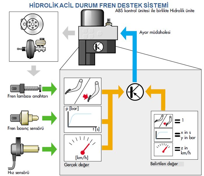 kontrol ünitesi 3 temel sensörden gelen sinyalleri değerlendirerek, fren destek