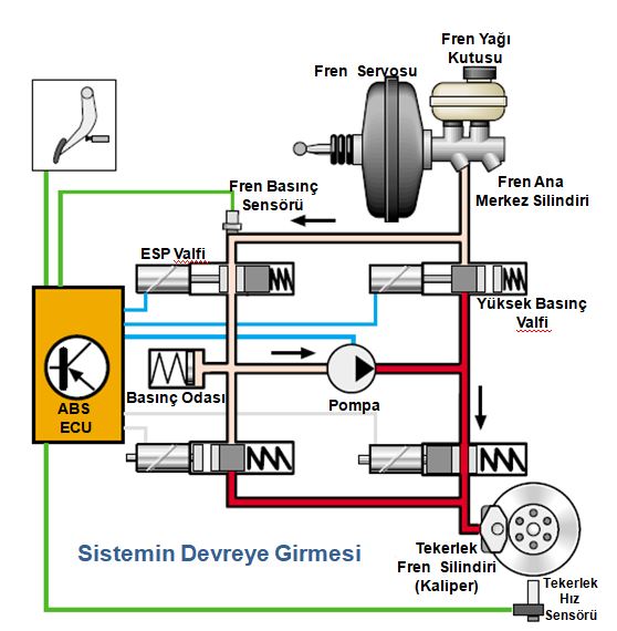 gelirse, bu durumda abs ünitesi gönderilen fren hidrolik yağı basıncını