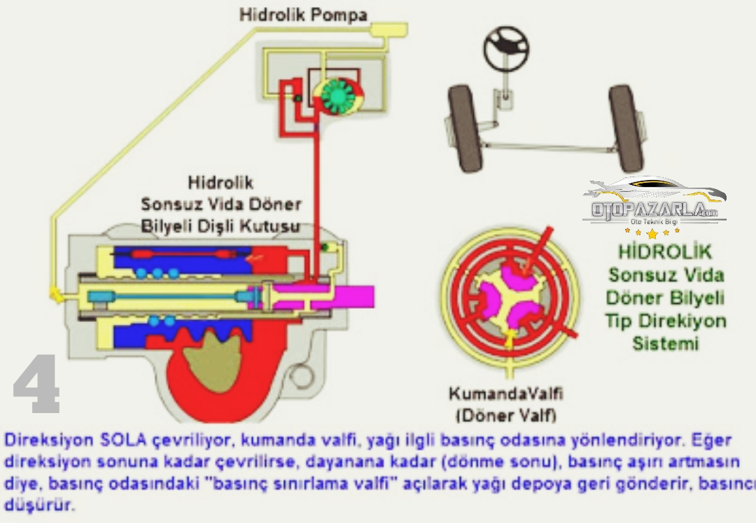 Direksiyon simidi döndürülürken, kumanda valfi hidrolik basıncı dönüş yönüne göre yönlendiriyor, o yönde ilave bir kuvvet elde ediliyor ve direksiyon döndürme kuvveti azalıyordu. Fakat direksiyon simidini bir miktar döndürüp, sabit olarak bu pozisyonda bir süre devam ettiğimizde neler oluyor? Hidrolik sistem nasıl çalışıyor?