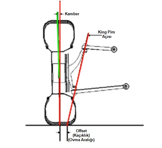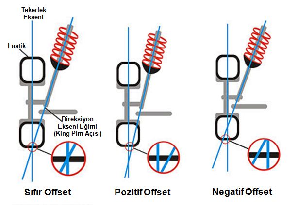 Offset (Kaçıklık): Lastiğin temas yüzeyinin ortasından geçen tekerlek ekseni ile direksiyon eğimi ekseninin (king pim) zeminle birleştiği nokta arasındaki mesafeye “kaçıklık veya “offset” denir. Buna lastiğin “ovma aralığı” da denir. Araçlar için en uygun olanı negatif offset’tir.