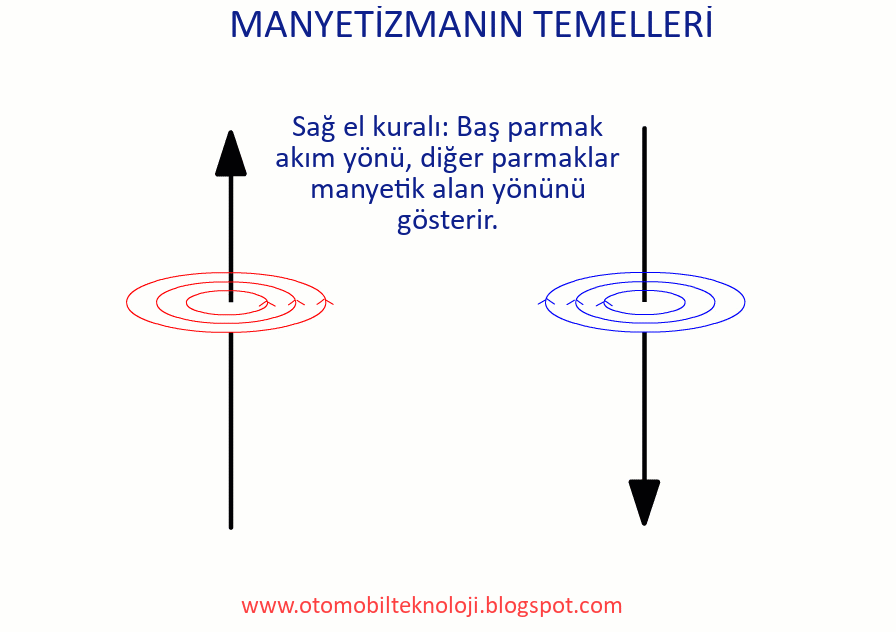 İletken telden elektrik akımı geçirildiğinde, iletkenin etrafında manyetik alan oluşur. Manyetik alan kuvvet hatlarının yönü, elektrik akımının yönüne göre değişir. Sağ el kuralına göre bu iletken tutulursa, baş parmak elektrik akımının yönünü, 4 parmak ise manyetik alan kuvvet hattının yönünü gösterir.