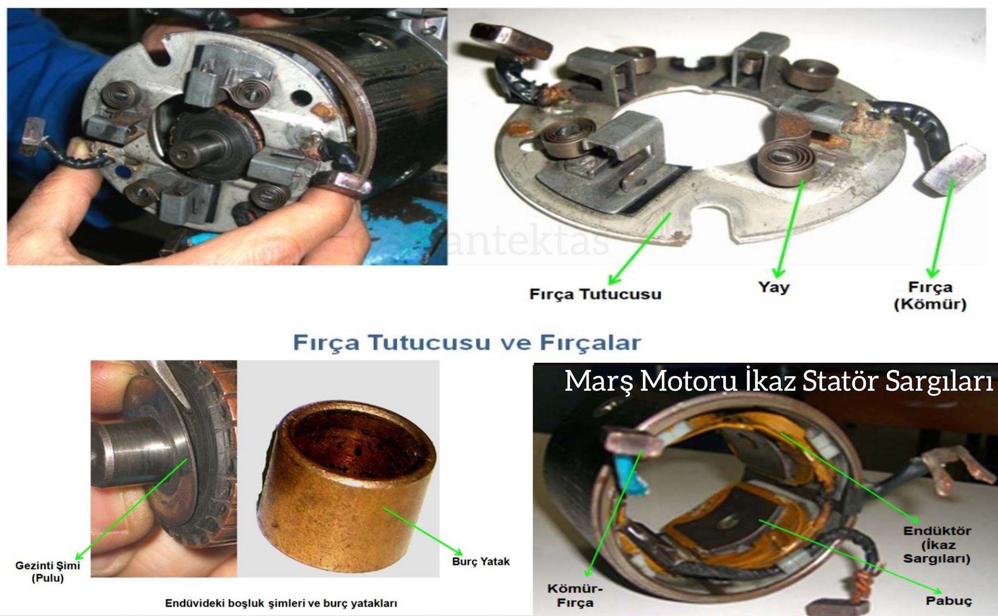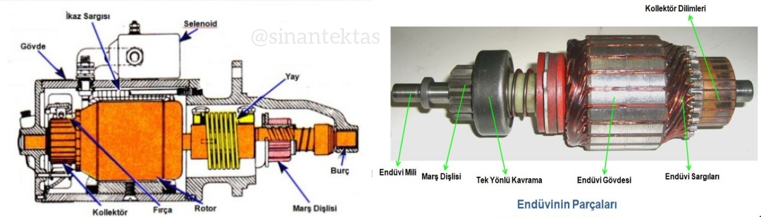 1. Endüktör (İkaz Sargıları)  2. Endüvi (Rotor)  3. Gövde ve Kapaklar  4. Tek yönlü kavrama tertibatı  5. Marş Dişlisi  6. Kömürler (Fırçalar) ve Fırça Tutucusu