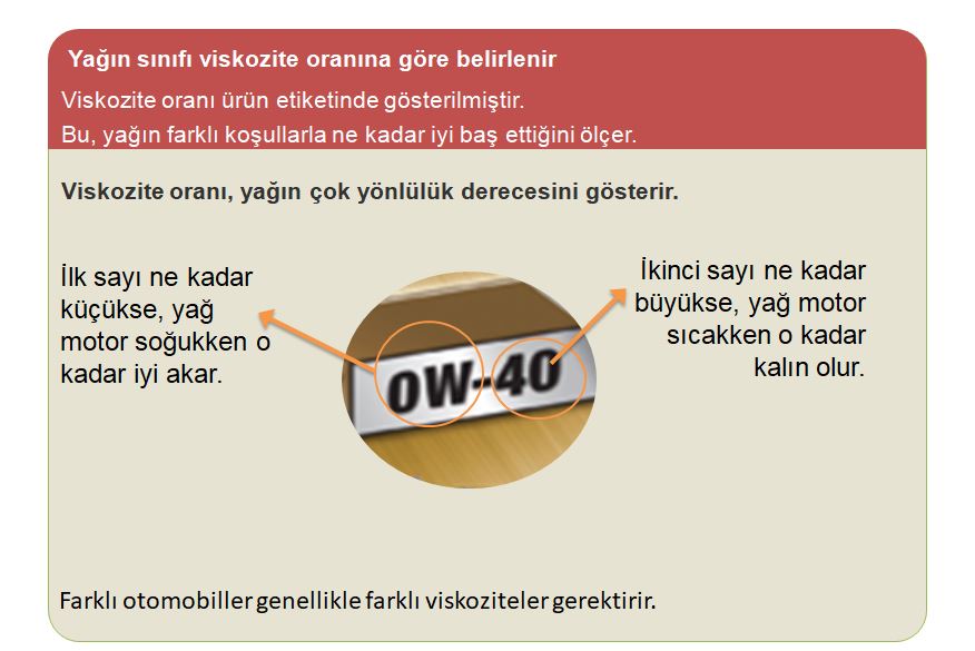 Yağın sınıfı viskozite oranına göre belirlenir. Viskozite oranı ürün etiketinde gösterilmiştir. Bu, yağın farklı koşullarla ne kadar iyi baş ettiğini ölçer. Viskozite oranı, yağın çok yönlülük derecesini gösterir. 0W-40 veya 5W-30 veya 10W-40 gibi. İlk sayı ne kadar küçükse, yağ motor soğukken o kadar iyi akar. İkinci sayı ne kadar büyükse, yağ motor sıcakken o kadar kalın olur.