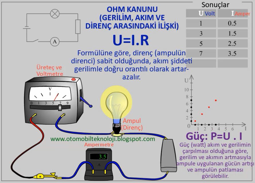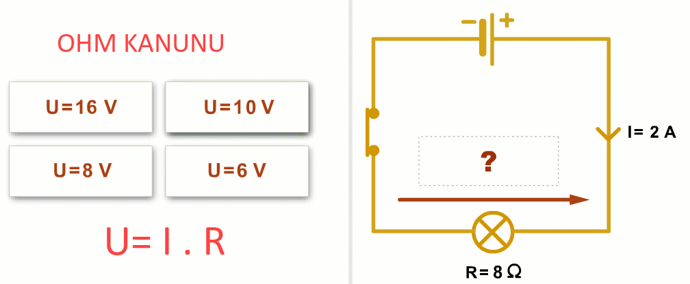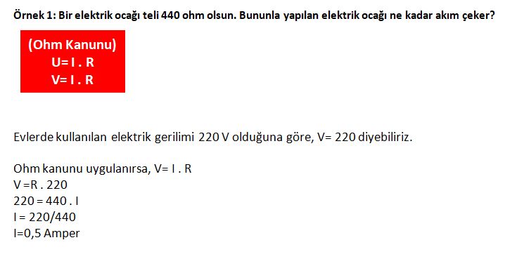 Örnek: Bir devrede direnç 8 ohm, akım 2 amper olduğunda, gerilimin hesaplanması: V=U.R ise V= 2.8 = 16 volt
