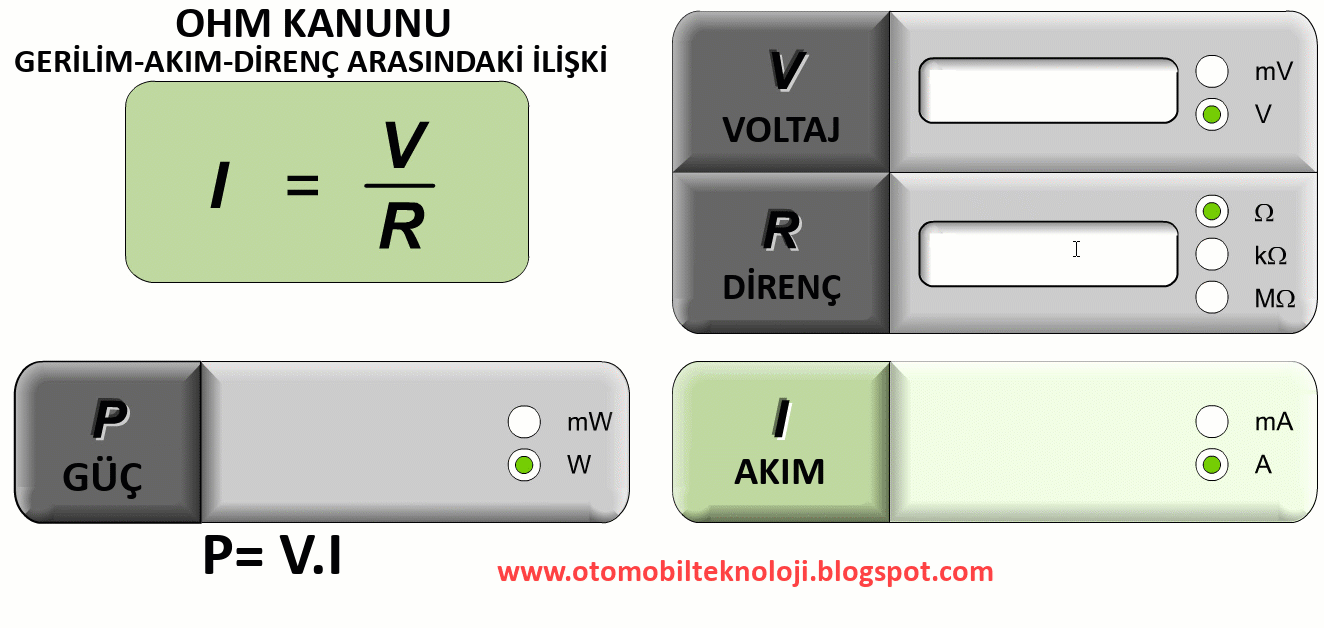 Gerilim, akım, direnç ve güç formülleri: