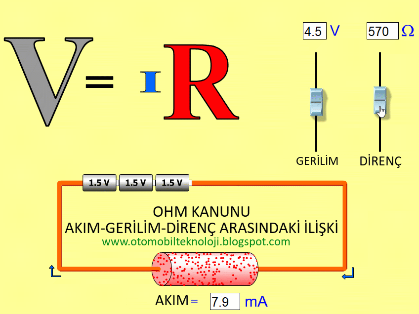 V=I x R formülüne göre Direnç, gerilim ve akımın değişimi: