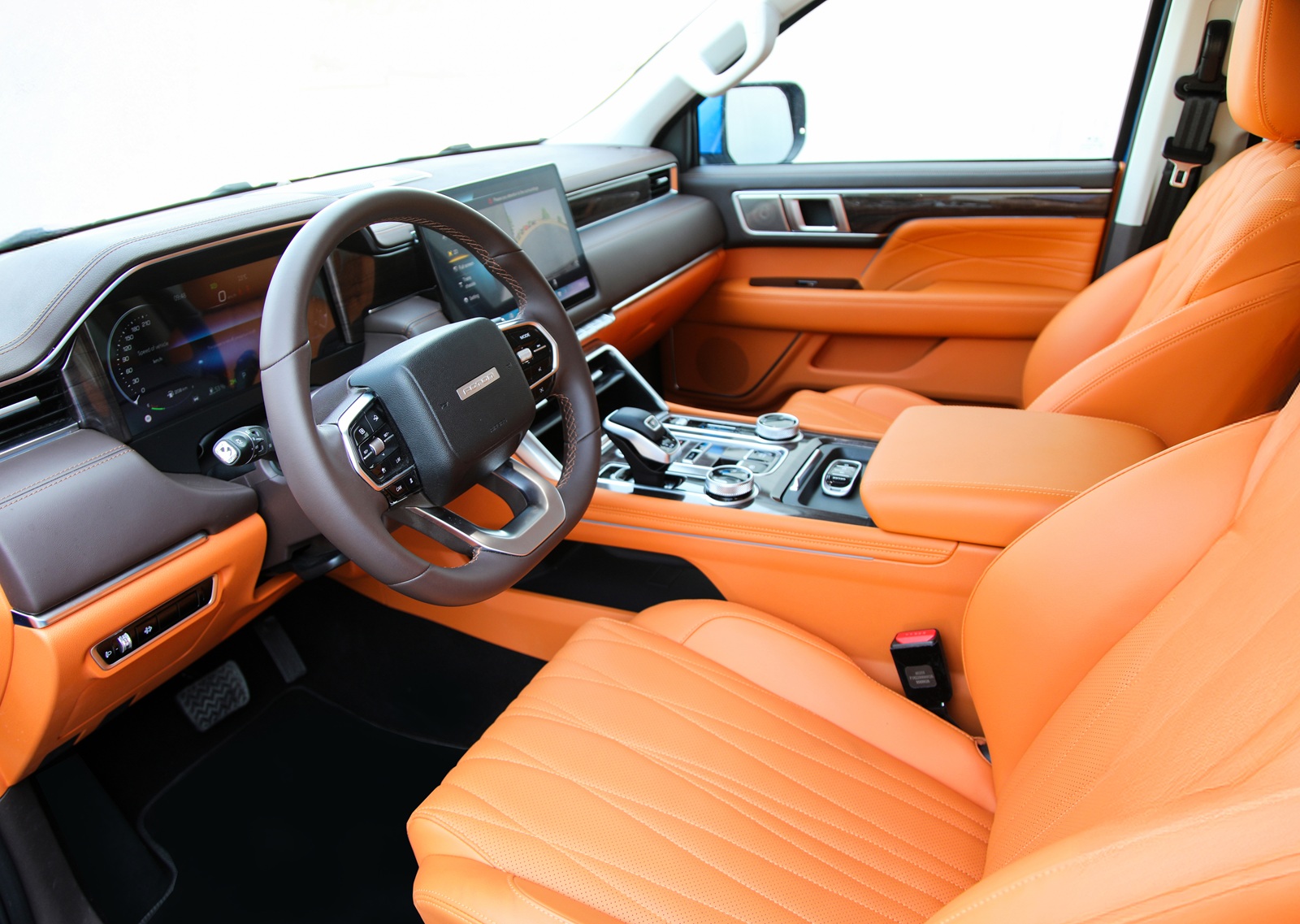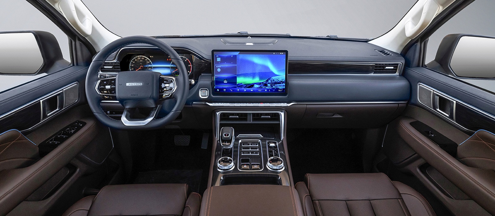 Tunland V9 kaslı gövdesi, geniş ön ızgarası ve dörtgen LED farlarıyla agresif bir tasarım çizgisine sahip. 5,6m uzunluğunda, 2,1m genişliğinde ve 1,95m yüksekliğinde olan araç, heybetli ve şık görünümüyle dikkat çekiyor. Panoramik cam tavanı, 10 yöne elektrikli ayarlanabilen hafızalı sürücü koltuğu ve ısıtma/soğutma özellikli ön koltukları standart olarak sunan pick-up, gelişmiş ses yalıtımı, 14.6 inç HD ekranı, şerit takip sistemi, sürücü yorgunluk algılama sistemi ve sesle aktive edilen akıllı kokpiti ile kullanıcısına premium deneyim sunuyor. Tunland V9 yolcu bölümündeki 220V elektrik çıkışı, araç içi düz zemini ve helezon yaylı arka süspansiyonu sayesinde, her yol şartında konforlu bir yolculuk vadediyor.