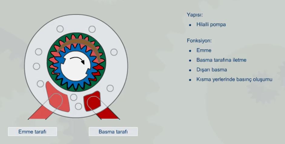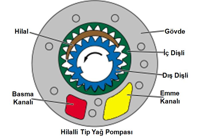 taşınır; bu sırada hilal, yağın geri akmasını engeller. Devam eden dönüşle dişliler