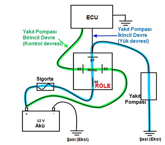 röleyi kumanda etmek (çalıştırmak) için (ECU’den gelir), diğer ise yakıt pompasına gönderilen beseleme gerilimidir. Her ikisi de kontak açıkken, sigorta