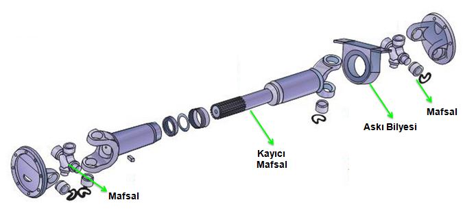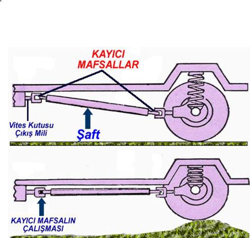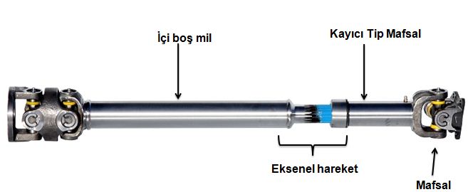 (Şaft milinin yapısı: İçi boş mil, eksenel harekt eden kayıcı tip mafsal, üniversal mafsallar)