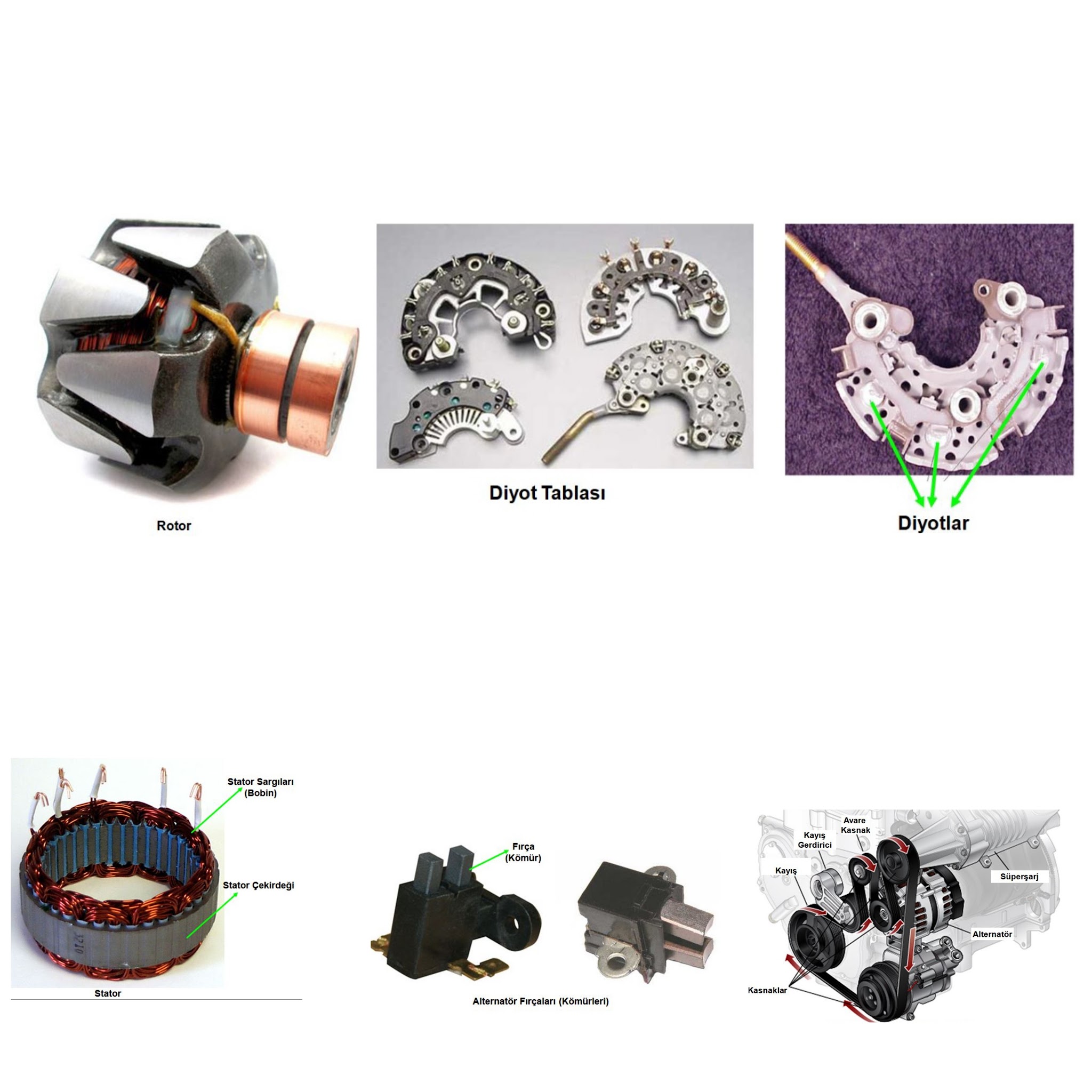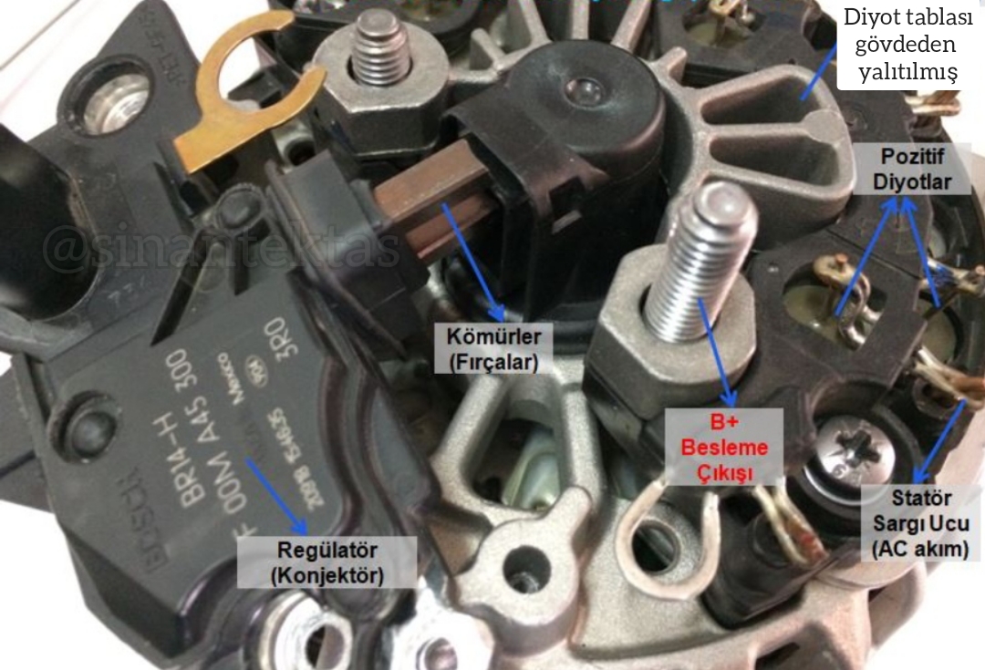 1. Rotor   2. Statör   3. Diyot Tablası  4. Regülatör - Konjektör  5. Fırçalar - Kömürler