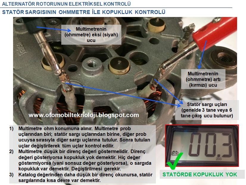 birine, diğer ölçüm ucuysa statörün demir gövdesine tutulur. Multimetre