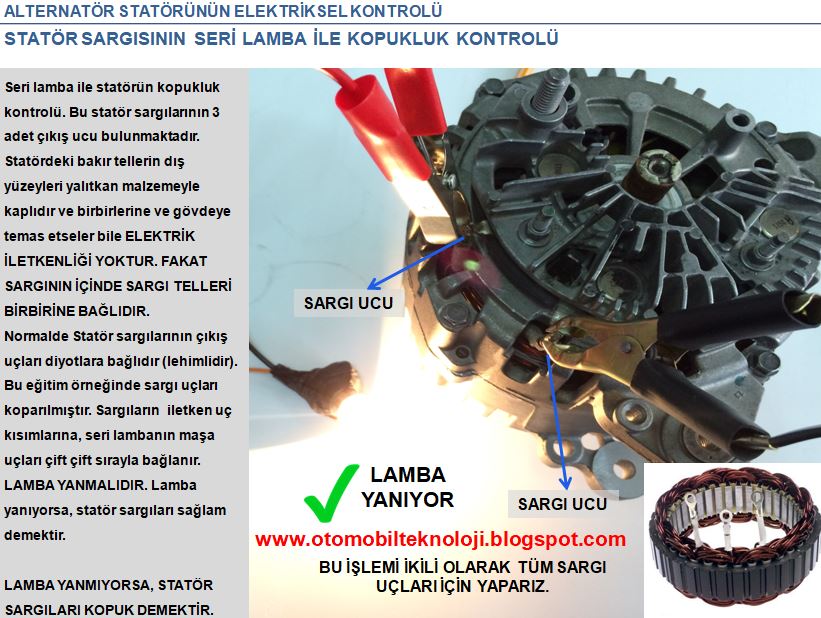 uçları çift çift sırayla bağlanır. LAMBA YANMALIDIR. Lamba yanıyorsa, statör
